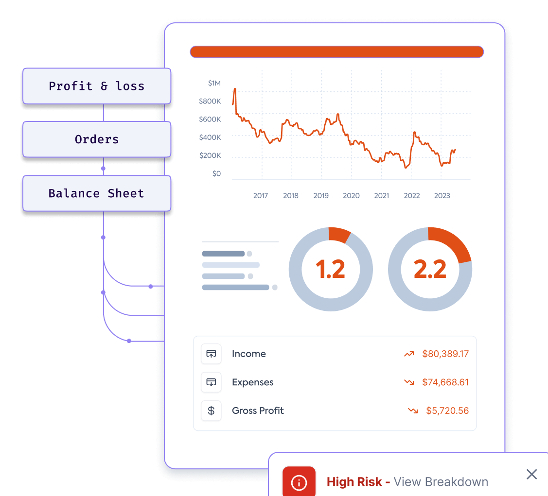 This standardizes the data irrespective of its source and helps you make a comprehensive assessment of your customer's financial health, produce additional insights (e.g. calculate financial ratios), and automate decisioning based on these insights.